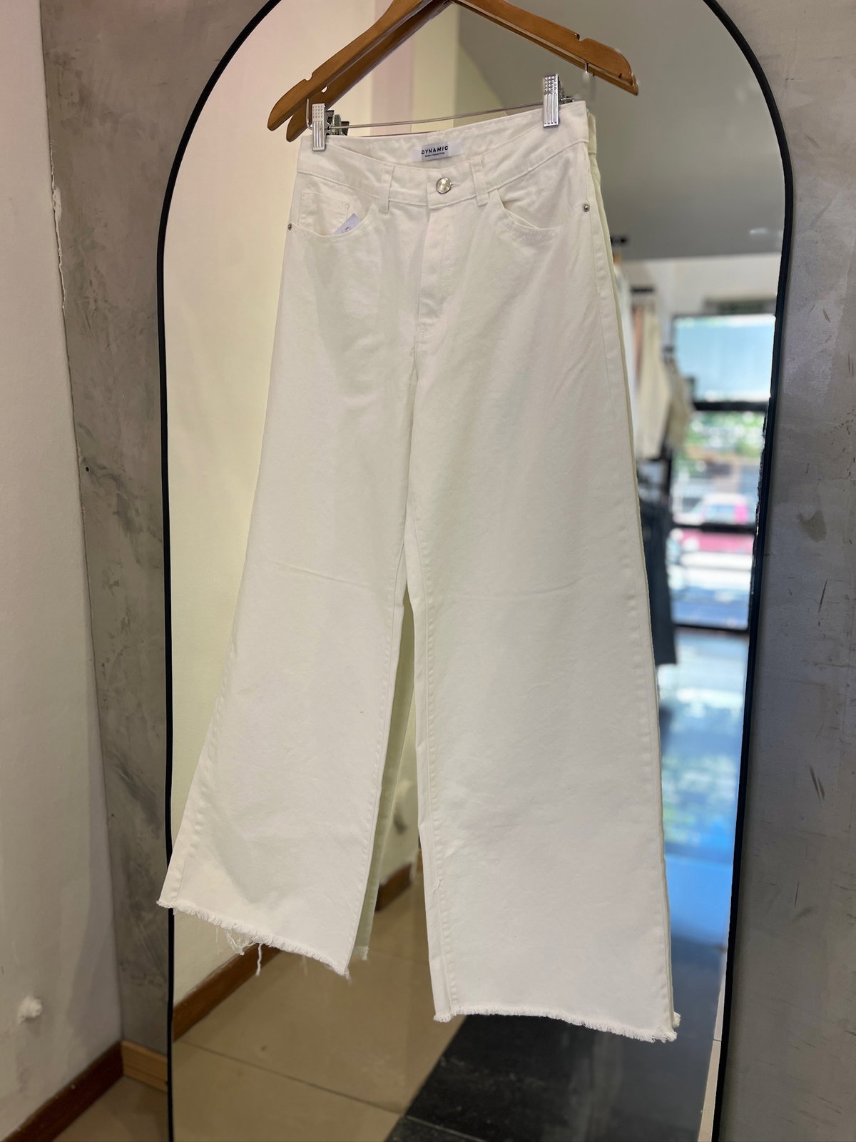 Jean rígido de piernas amplias tipo wide leg. Modelo de tiro alto con cinco bolsillos, cierre frontal y botón metálico.